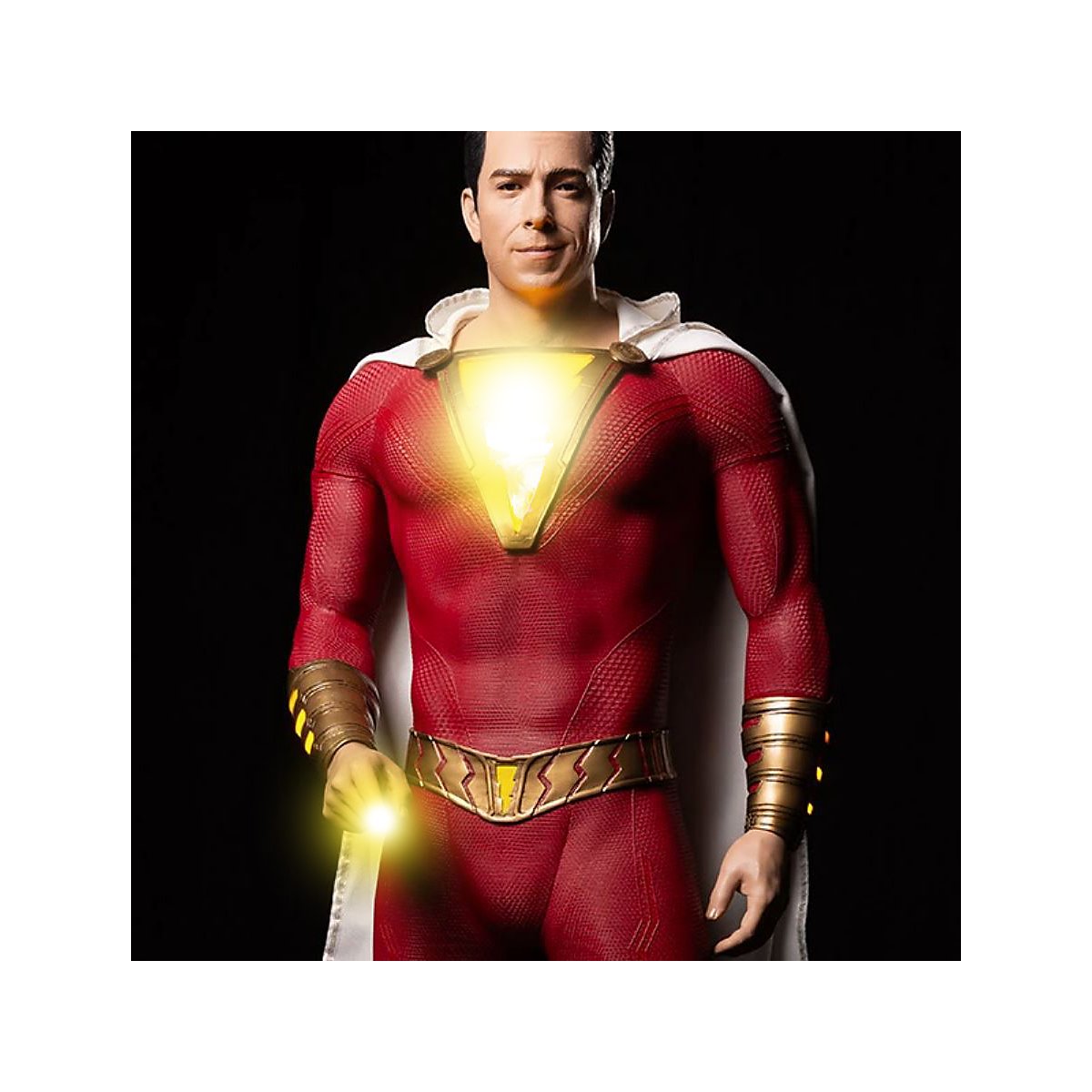 This set includes the lights on the chest and in the gloves as seen in the movie. The finger flashes and when ordered with the additional voice module (item 504060), the Life Size Shazam statue actually becomes interactive and speaks the line "Your phone is charged!" when approached - via a motion sensor). There are also 7 USB charging ports for smartphones (item 504061)