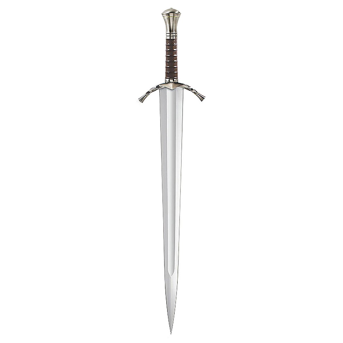 This is the replica of the sword of Boromir, a rather tragic character from the Lord of the Rings trilogy. As the son of the Seneschal of Gondor, Denethor, he is assigned to accompany Frodo to Mount Doom to destroy the Ring of Power. On the arduous journey, he falls victim to the dark attraction of the ring and tries to take it away from Frodo. However, he dies heroically while trying to save the hobbits Merry and Pippin from a horde of orcs.